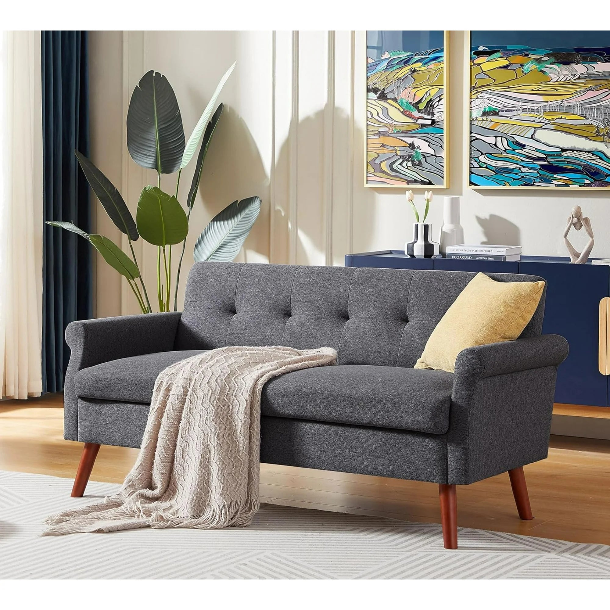 Mid-century Modern Small Loveseat:Plush clustered backrest design contours to your body's curves, offering comfy sofa backrest experience for ultimate relaxation. The graceful curved armrests add a touch of refinement, enhancing your home furniture decor.