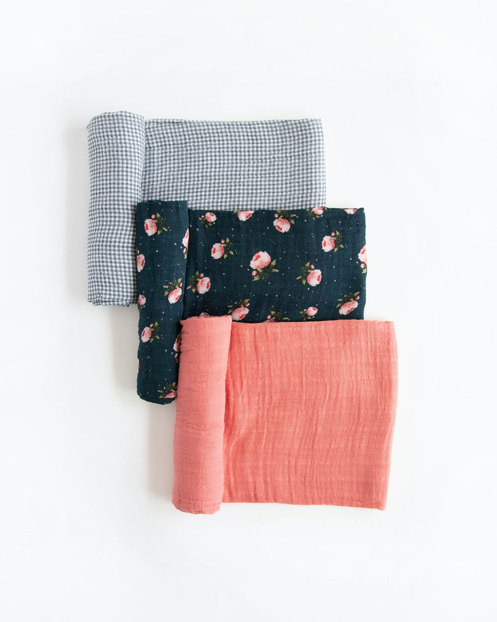 Cotton Muslin Swaddle Blanket 3 Pack - Midnight Rose