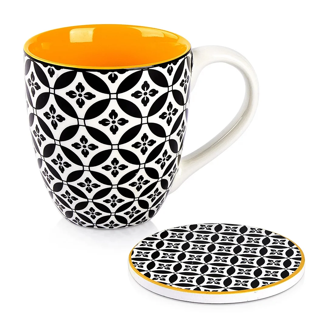 DOWAN Coffee Mug, 19 oz Large Porcelain Mug with Coaster for Coffee Tea Milk Cocoa, Ceramic Coffee Cup with Handle for Gift, Colorful, Black and Yellow