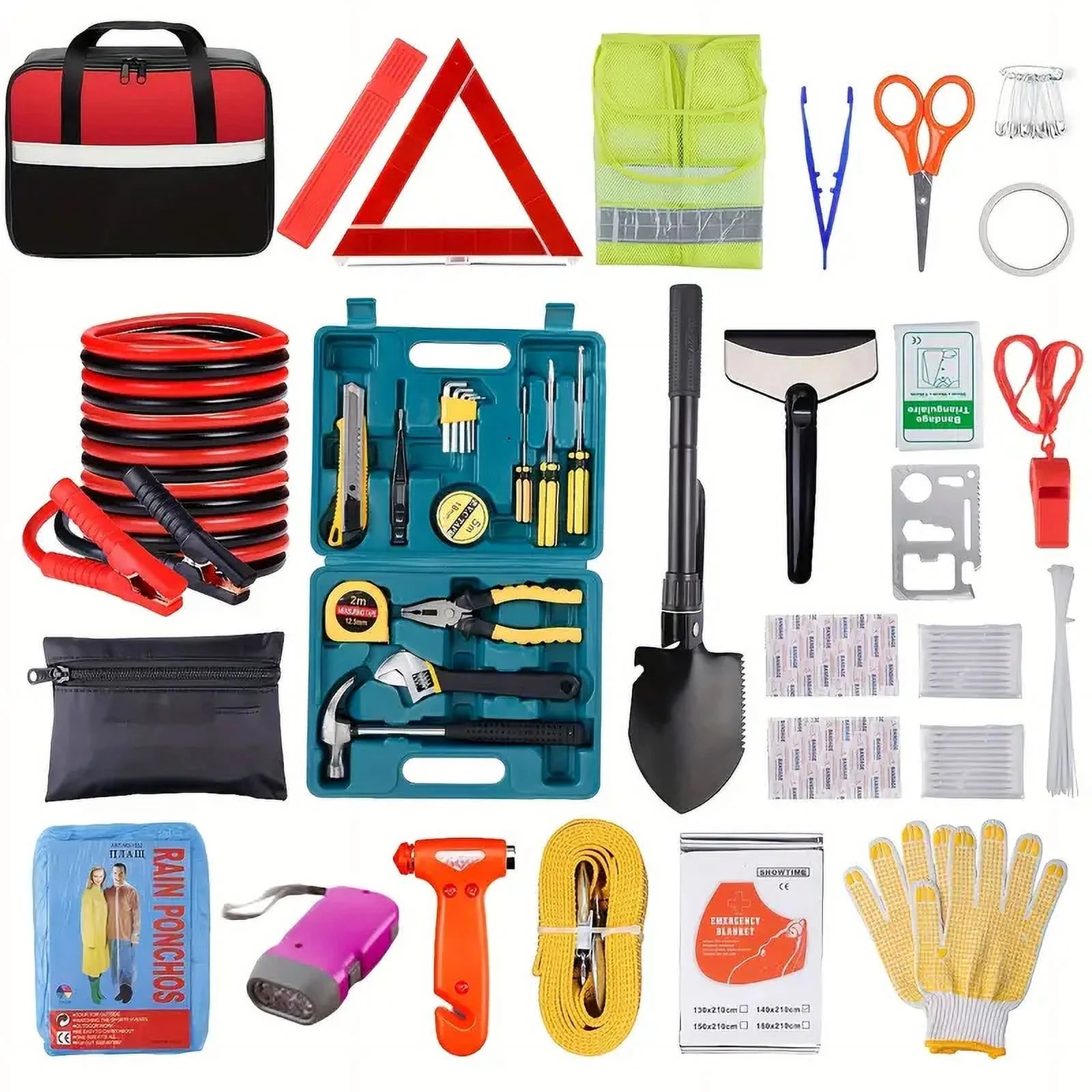 Every driver should have one of the best emergency car kits somewhere in their car. Be ready for the unexpected with this 120-piece Emergency Roadside Kit. Whether you're stranded with a dead battery, or in need of basic roadside assistance, this all-in-one toolset has you covered. Packed with a durable tow rope, heavy-duty jumper cables, a folding snow shovel, flashlight, gloves, tire repair tools, and more, it's the perfect kit for drivers of all experience levels. Compact, portable, and designed for all-season reliability, it fits easily in your car, truck, or SUV. A thoughtful and practical gift for new drivers, commuters, or anyone who spends time on the road.
