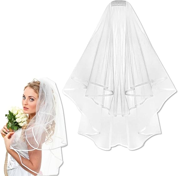 OBTANIM Bridal Veil White Double Ribbon Edge Wedding Veil with Comb for Wedding Bachelorette Party