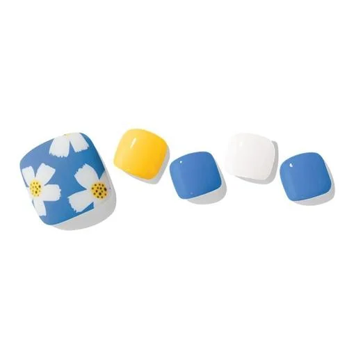 A fresh blue pedicure design. The large white flowers express the windy summer skies, and the accent pieces have been given a matte finish to contrast with the glossy finish of the solids for a trendy look.