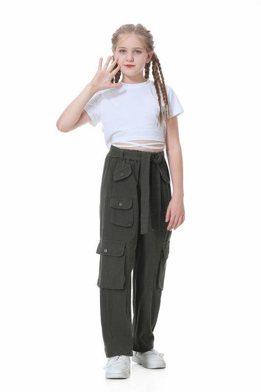 Rolanko Girl's High-Waisted Cargo Pants: Multiple Pockets, casual daily sports and dancing.