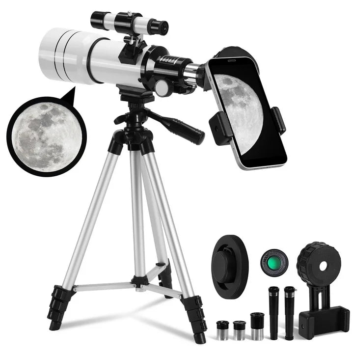Upgraded 70mm Large-Aperture Objective: The upgraded astronomical telescope has a 70MM large-diameter objective with a focal length of 300MM, with a larger and clearer imaging range than other ordinary telescopes. The larger the aperture, the more light can be collected, and the farther and fainter stars can be seen.