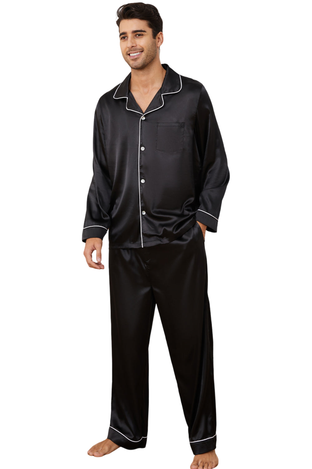 Vulcanodon Men long sleeve satin pajamas is the ultimate in comfort and luxury. Available in a wide variety of sizes and colors. This lightweight pajama set is soft, breathable and skin-friendly, help you have a sound sleep.